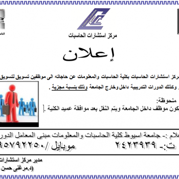 يعلن مركز استشارات الحاسبات بكلية الحاسبات والمعلومات عن حاجته الي موظفين سويق لتسويق برامج المركز وكذلك الدورات التدريبية داخل وخارج الجامعة وذلك بنسبة مجزية