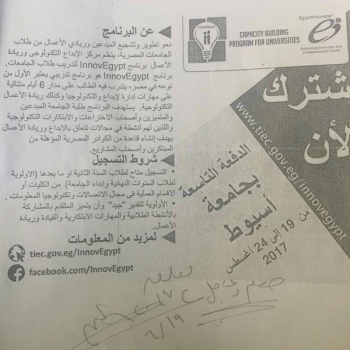يعلن مركز الإبداع التكنولوجي وريادة الأعمال التابع لوزارة الإتصالات وتكنولوجيا المعلومات عن برامج تدريبية للطلاب بالجامعة وذلك في الفترة من 19/8/2017 وحتى 24/8/2017 ، حيث ستقام بالقاعة الملحقة بقاعة…