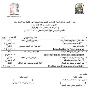 جدول المحاضرات والعملي للدبلومات المهنية في تكنولوجيا المعلومات للفصل الدراسي الأول للعام الجامعي 2016/2017م :