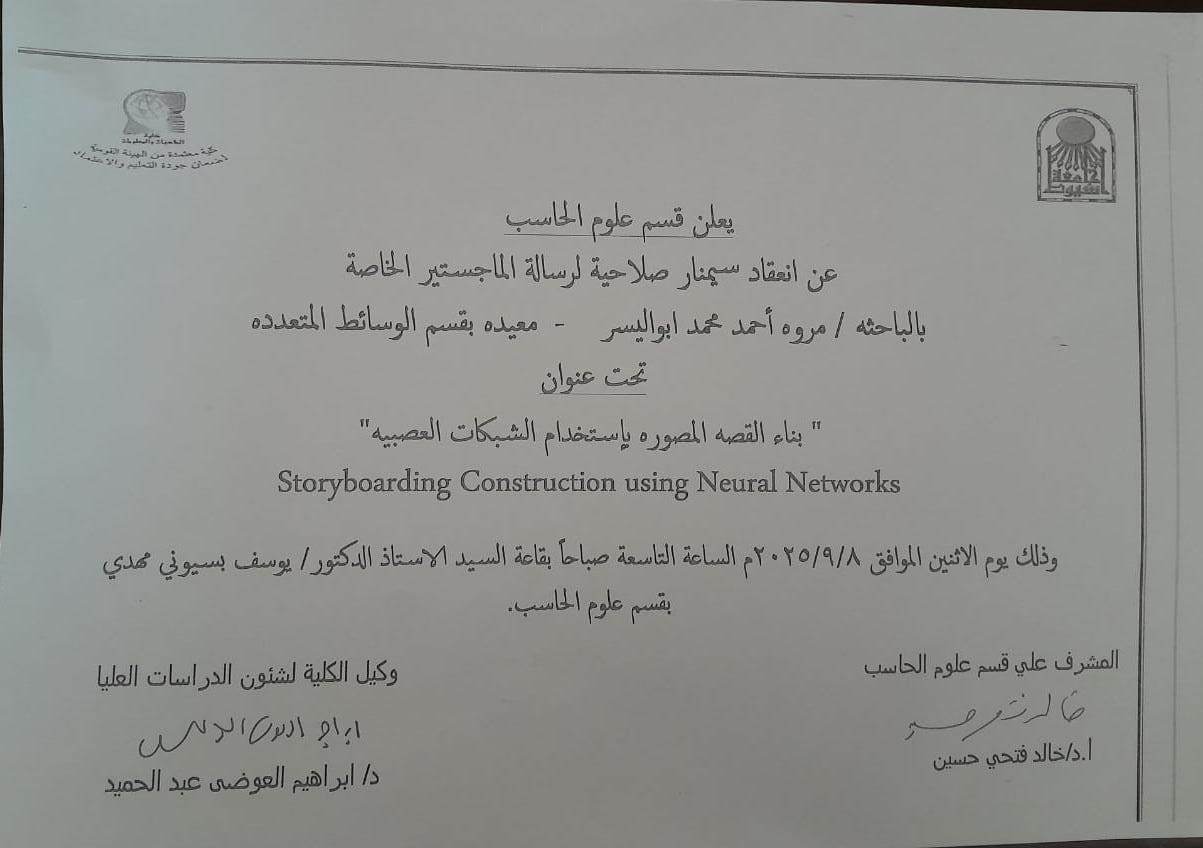 يعلن قسم نظم المعلومات عن انعقاد سمينار تسجيل نقطة البحث لدرجة الماجستير الخاصة / للباحث عبد الرحمن حسن محمد بقسم نظم المعلومات 8 سبتمبر 2025 يعلن قسم نظم المعلومات عن انعقاد سمينار تسجيل نقطة البحث لدرجة الماجستير الخاصة / للباحث عبد الرحمن حسن محمد بقسم نظم المعلومات وذلك يوم الاثنين 8/ 9/ 2025 الساعة 1.30 ظهرا بقاعة الاستاذ الدكتور يوسف بسيوني مهدي بقسم علوم الحاسب