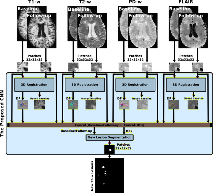 Introduction: Longitudinal magnetic resonance imaging (MRI) has an important role in multiple sclerosis (MS) diagnosis and follow-up. Specifically, the presence of new T2-w lesions on brain MR scans is considered a predictive biomarker for the disease. In this study, we propose a fully convolutional neural network (FCNN) to detect new T2-w lesions in longitudinal brain MR images. Methods: One year apart, multichannel brain MR scans (T1-w, T2-w, PD-w, and FLAIR) were obtained for 60 patients, 36 of them with new T2-w lesions. Modalities from both temporal points were preprocessed and linearly coregistered. Afterwards, an FCNN, whose inputs were from the baseline and follow-up images, was trained to detect new MS lesions. The first part of the network consisted of U-Net blocks that learned the deformation fields (DFs) and nonlinearly registered the baseline image to the follow-up image for each input modality. The learned DFs together with the baseline and follow-up images were then fed to the second part, another U-Net that performed the final detection and segmentation of new T2-w lesions. The model was trained end-to-end, simultaneously learning both the DFs and the new T2-w lesions, using a combined loss function. We evaluated the performance of the model following a leave-one-out cross-validation scheme. Results: In terms of the detection of new lesions, we obtained a mean Dice similarity coefficient of 0.83 with a true positive rate of 83.09% and a false positive detection rate of 9.36%. In terms of segmentation, we obtained a mean Dice similarity coefficient of 0.55. The performance of our model was significantly better compared to the state-of-the-art methods (p < 0.05). Conclusions: Our proposal shows the benefits of combining a learning-based registration network with a segmentation network. Compared to other methods, the proposed model decreases the number of false positives. During testing, the proposed model operates faster than the other two state-of-the-art methods based on the DF obtained by Demons.