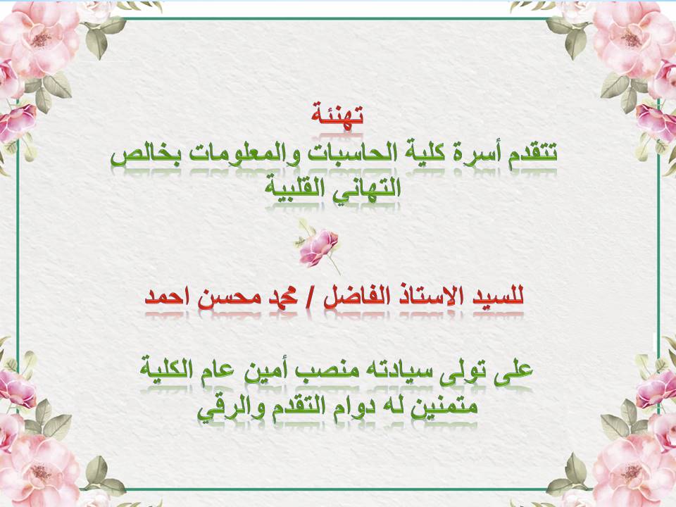 تتقدم أسرة كلية الحاسبات والمعلومات بخالص التهاني القلبية للسيد الاستاذ الفاضل / محمد محسن احمد على تولى سيادته منصب أمين عام الكلية
