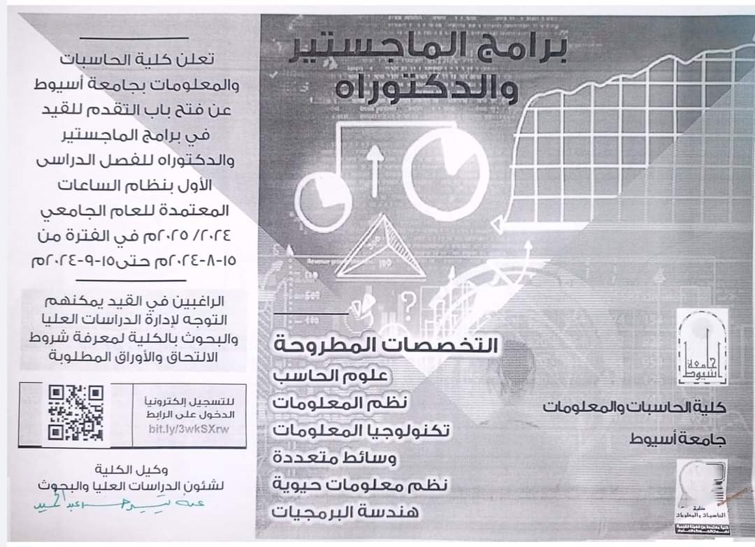 The Faculty of Computers and Information at Assiut University announces the opening of applications for enrollment in master’s and doctoral programs for the first semester on the credit hour system for the academic year 2024/2025 in the period from 8/15/2