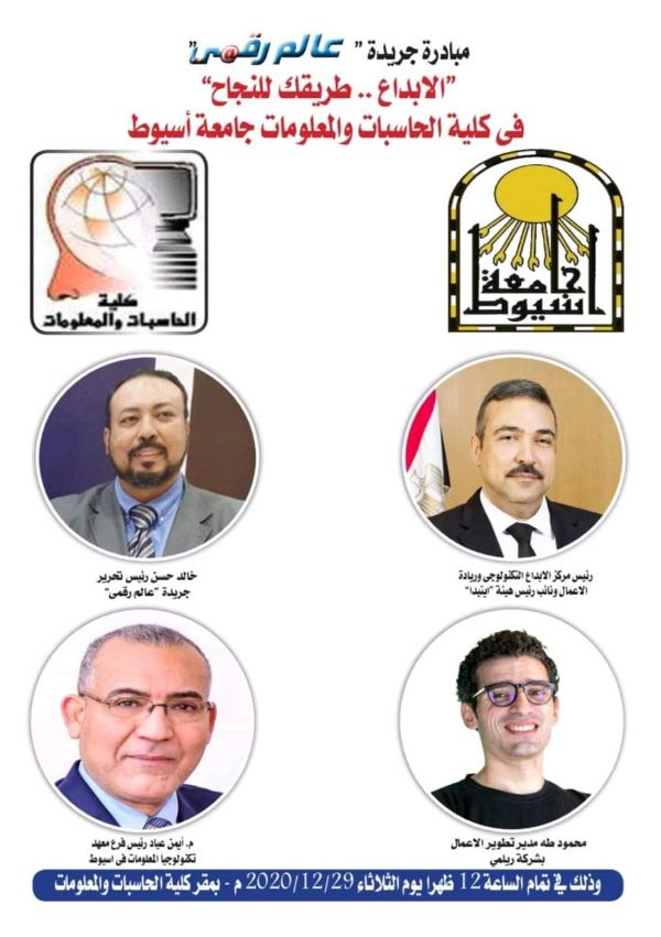 Invitation to attend the Digital World newspaper's "Creativity" initiative. Your path to success" at 12 noon on Tuesday, December 29, 2020 at the Faculty of Computers and Information at The University of Assiut will be part of the attendance directly at the college for part of the students with taking all precautionary measures and insurance instructions and the other part through the live broadcast through the branch page and will be at the end of the seminar withdraw ing on the number of 2 mobile phones for the attendees in the hall and withdrawing an electronic prize for the attendees online.