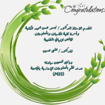 An honorary pass to the honorable lady, Prof. Dr. Tayseer Hassan, on the occasion of her appointment as Dean of the College