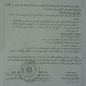 The Accounting and Auditing Department of the Faculty of Commerce, Assiut University, announces the continuation of admission to the Master's degree in Accounting
