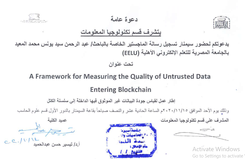An invitation to attend The Semnar registration of the master's thesis of the researcher / Mohamed Hassan Omar al-Muaid at the Egyptian Electronic University of Electronic Learning (EELU)