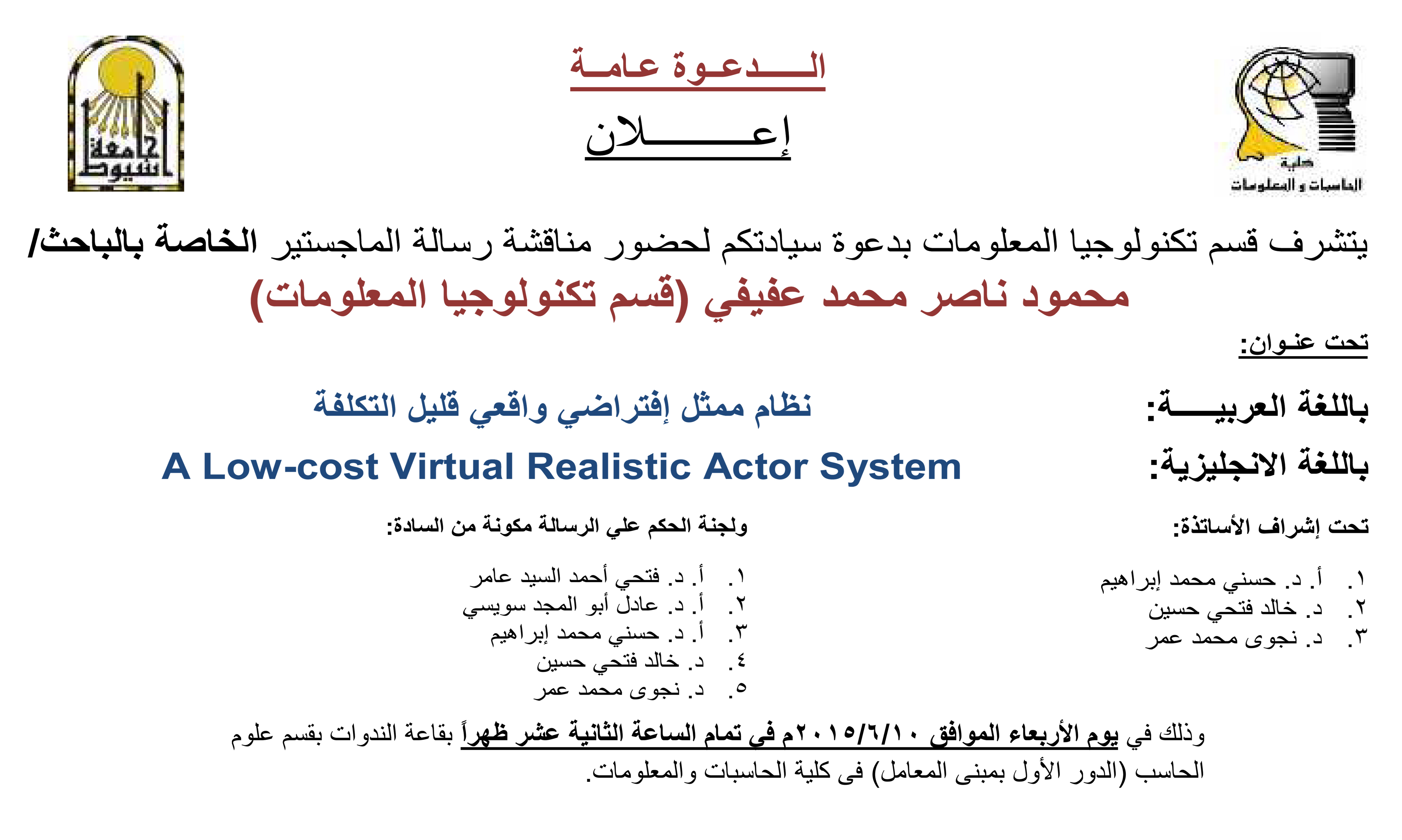 Invite you to attend the discussion of the special master researcher / Mahmoud Nasser Mohammed Afifi message 5 June 2015 Invite you to attend the discussion of the special master researcher / Mahmoud Nasser Mohammed Afifi message