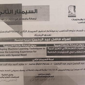 Invitation to attend the second seminar for the Master's thesis prepared by researcher / Israa Fadel Abdul Rahman (Kuwaiti nationality