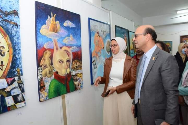 و خلال الافتتاح أبدي الدكتور أحمد المنشاوي إعجابه باللوحات الفنية المعروضة من حيث الإبداع و الأفكار و التصميم و الألوان و التي تدل علي التميز و الرقي والإبداع , مؤكداً في ذلك علي حرص إدارة الجامعة علي تبني ودعم المواهب المتميزة من أبنائها الطلاب ومشيداً في ذلك بدور أعضاء هيئة التدريس في رعايتهم وتشجيعهم وحثهم علي الابتكار والتميز. و قد أعرب الدكتور المنشاوي عن سعادته بافتتاح معرض تصوير لوحات فنية من إنتاج الطلاب تميز بمواكبته للفن الحديث حيث تأثر الطلاب في أعمالهم بالمدرسة السيريالية إحدي مدارس الفن التشكيلي الحديث، مؤكداً علي أهمية الموضوع الرئيسي الذي تناوله المعرض حيث عبر الطلاب عن قضايا العصر السياسية والاجتماعية من وجهة نظرهم مثل سد النهضة وقضايا المرأة والشتات الفكري والصراعات النفسية والوجدانية. و حول تفاصيل المعرض أوضحت الدكتورة سحر بطرس أن المعرض تضمن حوالي 40 لوحة من إبداع طلاب الفرقة الثانية قسم تصوير والتي قاموا بتنفيذها للحصول علي درجات أعمال السنة الخاصة بالفصل الدراسي الأول وقد استمع الدكتور المنشاوي لشرح مختصر من كل طالب عن لوحته و كان لكل لوحة اسم خاص بها مثل خيالات واقعية , عقل ثائر , خيال الطبيعة , وهم الأحلام ، طاقات مفقودة، ضمور فكري، نفوس منهكة، آلام وآمال، وصراع الخلود.
