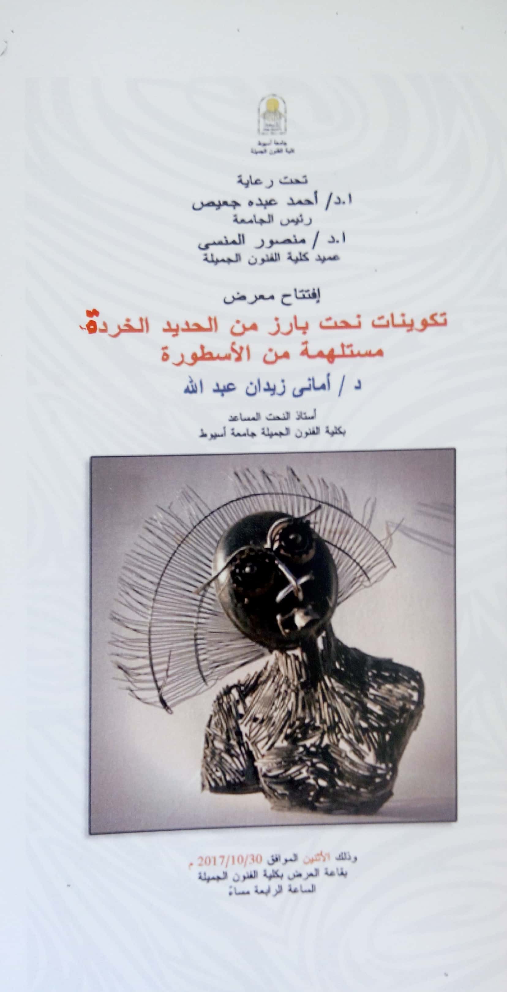 بعنوان ( تكوينات نحت بارز من الحديد الخردة مستلهمة من الأسطورة) وذلك يوم الاثنين الموافق 30/10/2017 بقاعة العرض بكلية الفنون الجميلة