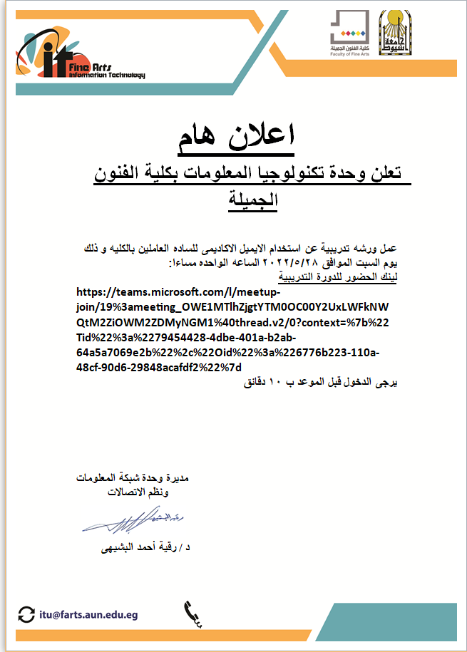 تحت رعاية الأستاذ الدكتور أحمد المنشاوى نائب رئيس الجامعة لشئون الدراسات العليا والبحوث والمشرف على الكلية تعلن وحدة تكنولوجيا المعلومات بكليه الفنون الجميله عن عمل ورشه تدريبية عن استخدام الايميل الاكاديمى للساده العاملين بالكليه و ذلك يوم السبت الموافق ٢٨/٥/٢٠٢٢ الساعه الواحده مساءا: