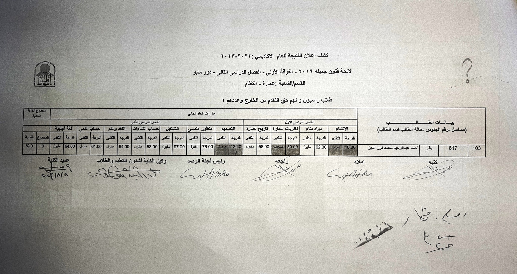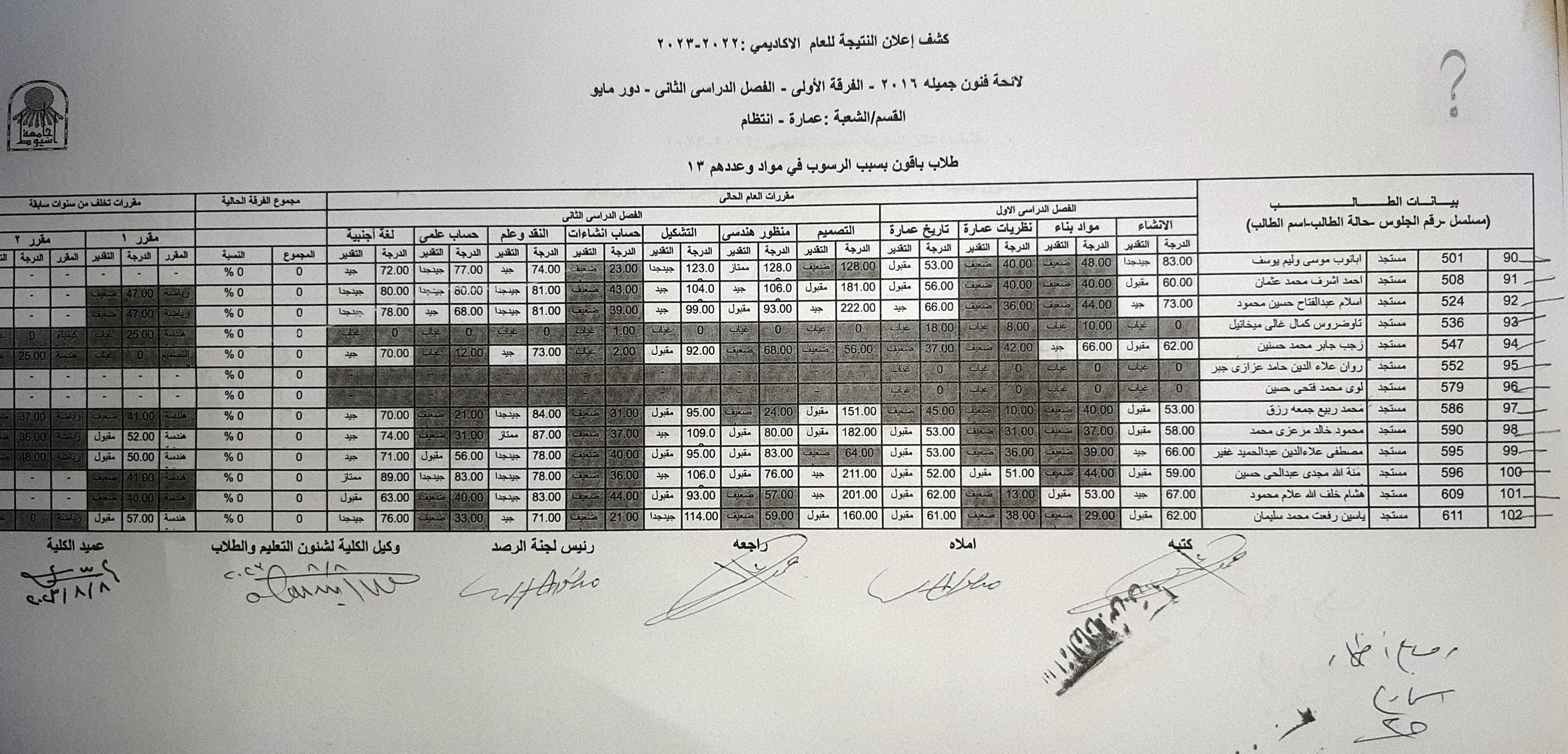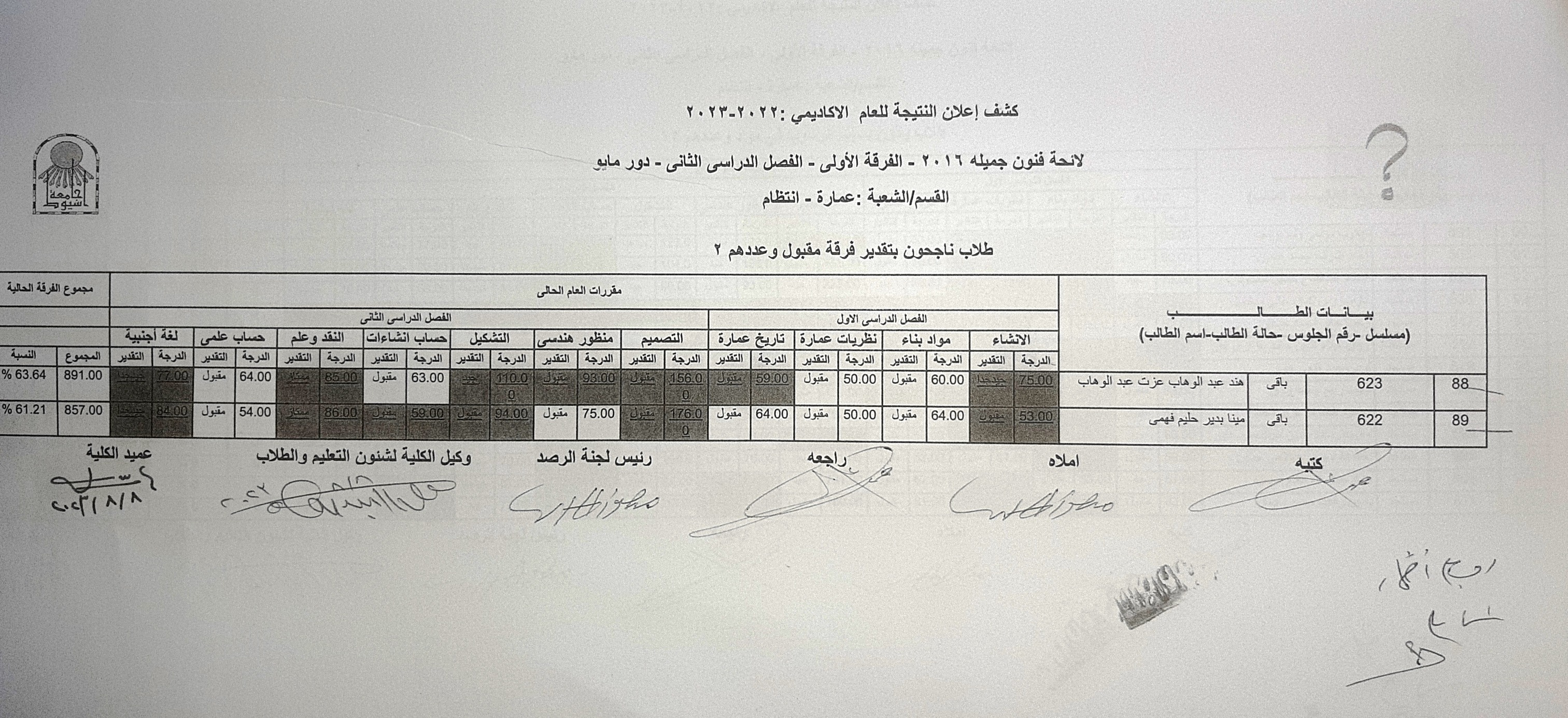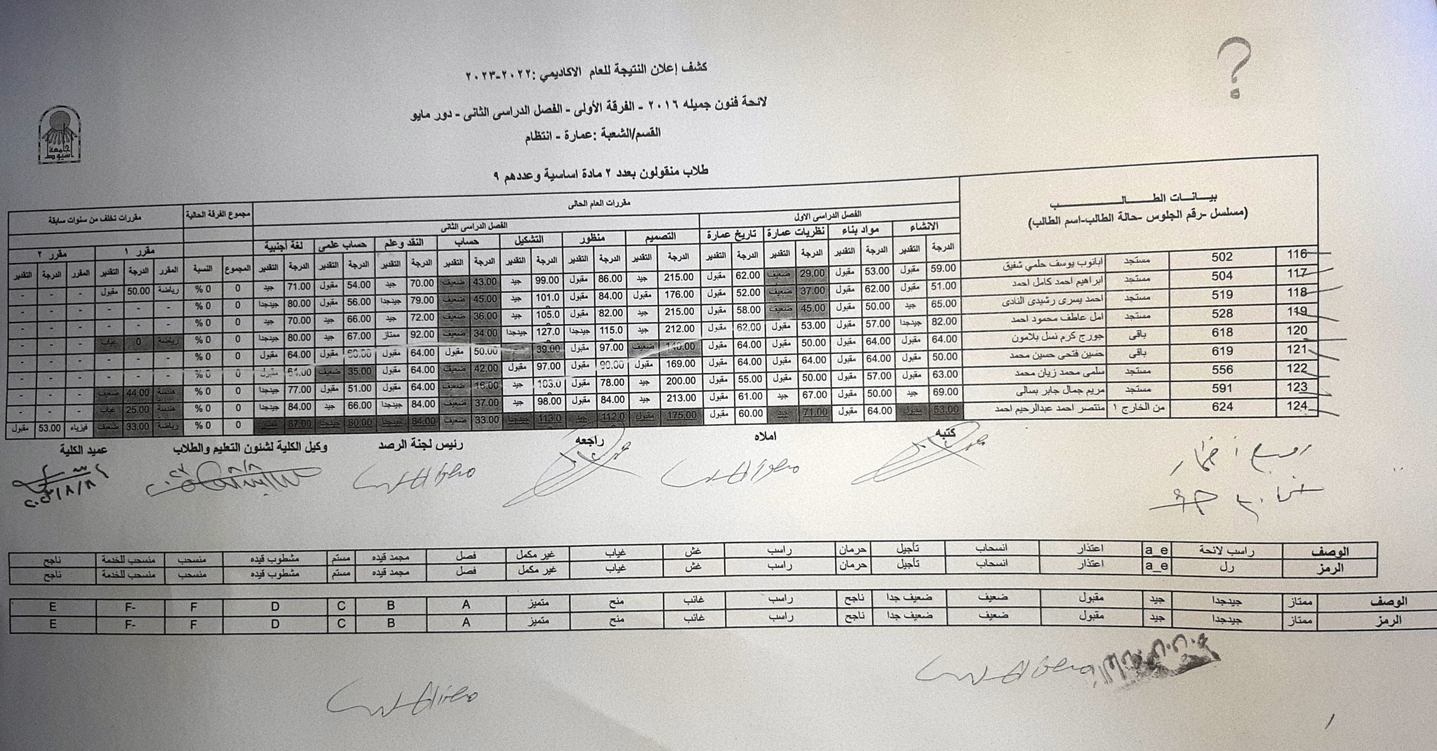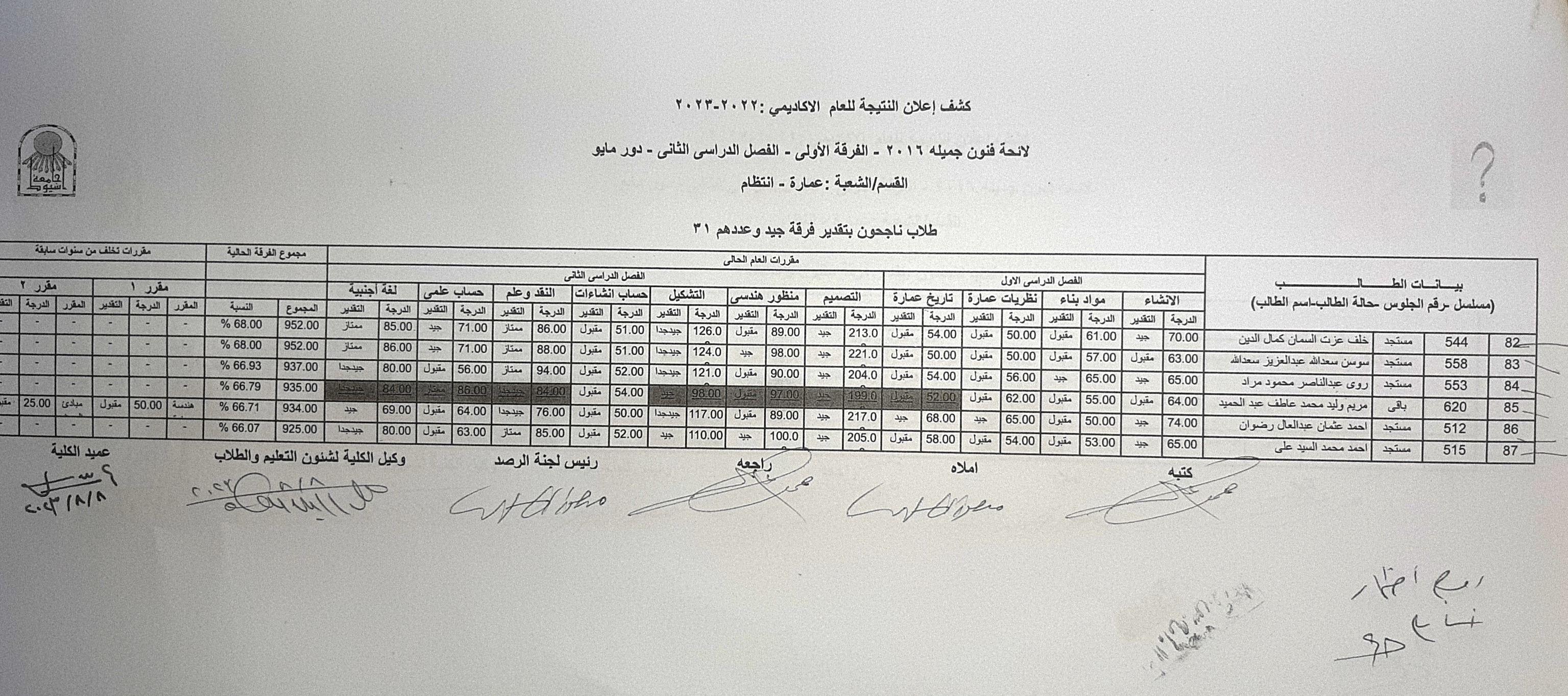اعلان نتيجة الفرقة الاولى - قسم العمارة 10 أغسطس 2023 اعلنت كلية الفنون الجميلة نتيجة الفرقة الاولى بقسم العمارة فور اعتمادها بعد اعمال المراجعة وينتظر طلاب الكلية نتائج الفصل الدراسى ونهاية العام ويتابع الطلاب بأهتمام ..ومن ثم يتم الاعلان عن النتائج تباعا بعد انتهاء اعمال المراجعة والاعتمادات