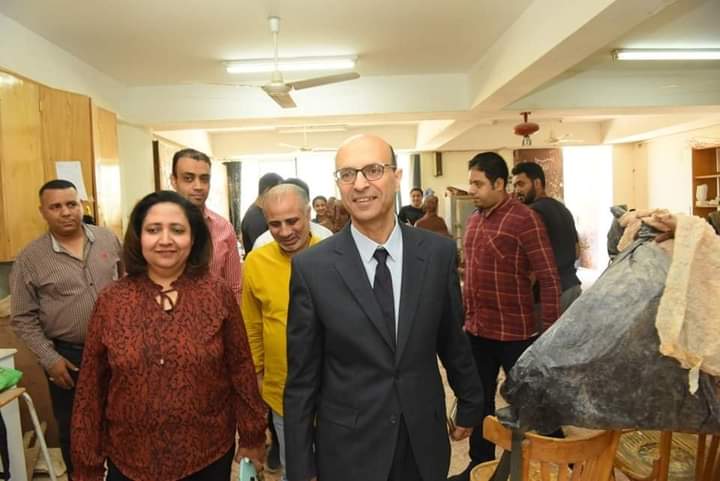وذلك للاطمئنان على حسن سير الامتحانات بالكلية في يومها الثاني و التي قد بدأت أمس السبت ٢١ مايو ، و التي شهدت اليوم إجراء نحو ١٥٠ طالب و طالبة من الفرقة الرابعة بمختلف أقسام الكلية لامتحانات الفصل الدراسي الثاني و التي تشمل أقسام العمارة ، الديكور بشعبتها ، النحت الميداني ، التصوير بشعبتها ، الجرافيك.