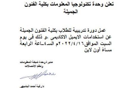 تعلن وحدة تكنولوجيا المعلومات بكلية الفنون الجميلة عن عمل دورة تدريبية للطلاب عن استخدام الايميل الاكاديمي