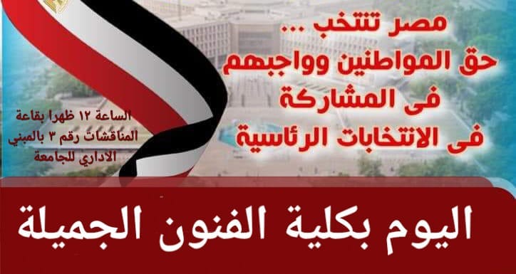 تحت رعاية السيد الاستاذ الدكتور/ أحمد المنشاوي رئيس جامعة أسيوط، والسيد الاستاذ الدكتور/ أحمد عبد المولى نائب رئيس الجامعة لشئون التعليم والطلاب تعقد بالكلية اليوم الخميس ٧ ديسمبر ندوة توعوية تحت عنوان "مصر تنتخب .. حق الشباب وواجبهم في المشاركة في الانتخابات الرئاسية"