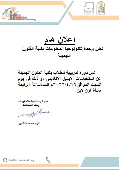 تعلن وحدة تكنولوجيا المعلومات بكلية الفنون الجميلة