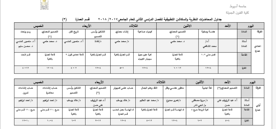 جداول المحاضرات النظرية والسكاشن التطبيقية للفصل الدراسي الثاني للعام الجامعي2017/ 2018 قسم العمارة 5 فبراير 2018 جداول المحاضرات النظرية والسكاشن التطبيقية للفصل الدراسي الثاني للعام الجامعي2017/ 2018 قسم العمارة