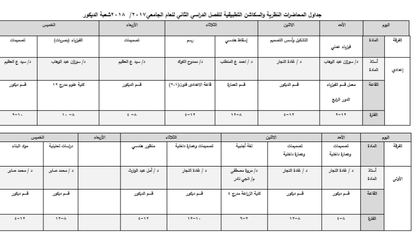 جداول المحاضرات النظرية والسكاشن التطبيقية للفصل الدراسي الثاني للعام الجامعي2017/ 2018 شعبة الديكور 5 فبراير 2018 جداول المحاضرات النظرية والسكاشن التطبيقية للفصل الدراسي الثاني للعام الجامعي2017/ 2018 شعبة الديكور