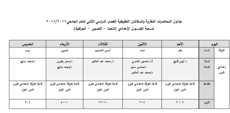 جداول المحاضرات النظرية والسكاشن التطبيقية للفصل الدراسي الثاني للعام الجامعي2017/2018 شــــعبة الفنـــــــون الإعدادي (النحت – التصوير - الجرافيك)