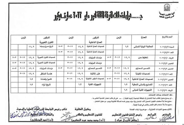 جداول امتحانات الفرقة الثالثة للفصل الدراسي الثاني للعام الجامعي ٢٠٢٢/٢٠٢١م