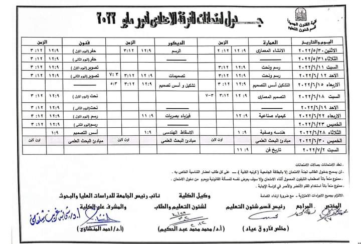 جدول امتحانات الفرقة الاعدادي للفصل الدراسي الثاني للعام الجامعي ٢٠٢٢/٢٠٢١م