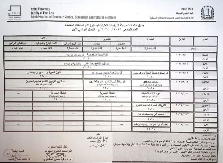 جدول امتحانات الفصل الدراسى الاول للدراسات العليا بنظام الساعات المعتمدة