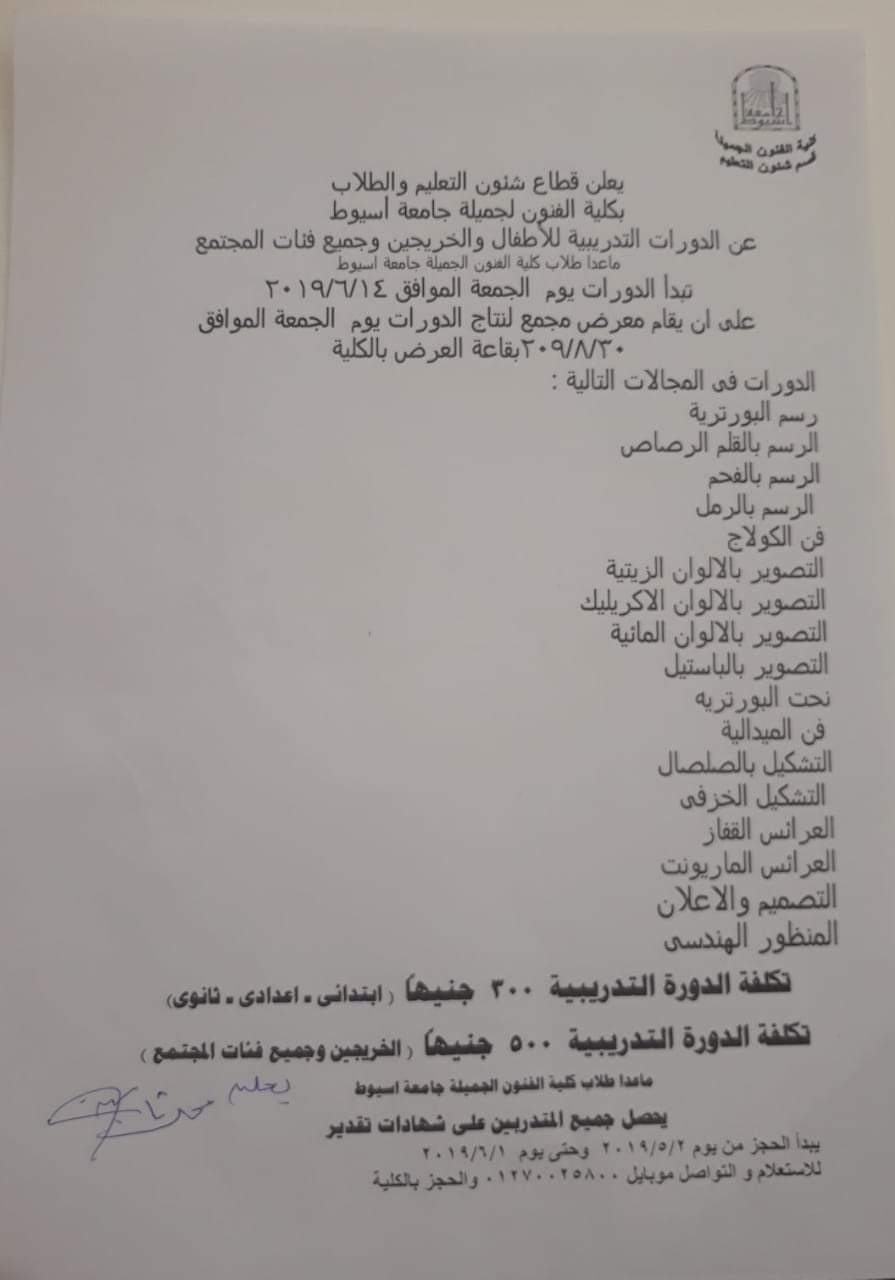 أعلن الدكتور محمد ثابت بداري عميد كلية الفنون الجميلة عن بدء تنظيم الكلية عدداَ من الدورات التدريبية للأطفال و الخريجين و جميع فئات المجتمع و المتخصصة فى المجالات الفنية و الفنون التشكيلية و الأعمال الفنية و الخشبية ،و ذلك تحت رعاية الدكتور طارق الجمال رئيس جامعة أسيوط ، و الدكتور شحاتة غريب شلقامى نائب رئيس الجامعة لشئون التعليم و الطلاب.