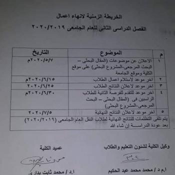 …الخريطة الزمنية لإنهاء اعمال الفصل الدراسي الثانى ٢٠٢٠/٢٠١٩م