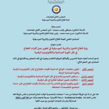 دعوة للمشاركة السادة اعضاء هيئة التدريس بالكلية للمشاركة فى المنتدى العلمى للجنة الفنون والتربية الموسيقية بابحاث فى محاور المنتدى