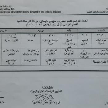 جداول محاضرات الفصل الدراسي الأول لمرحلة (الماجستير) للأقسام (العمارة - التصوير - النحت )للعام الجامعي 2023/ 2024م
