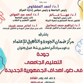 دعوة حضور ورشة عمل بعنوان (جودة التعليم الجامعى فى ضوء اهداف الجمهورية الجديدة)