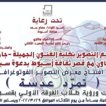 الأستاذ الدكتور /أحمد المنشاوي نائب رئيس الجامعة لشئون الدراسات العليا والبحوث والمشرف على كلية الفنون الجميلة يفتتح معرض التصوير الفوتوغرافى الثانى لطلاب الفرقة الأولى بكلية الفنون الجميلة تحت عنوان " تمرد عدسة "والمنعقد بقصر ثقافة أسيوط