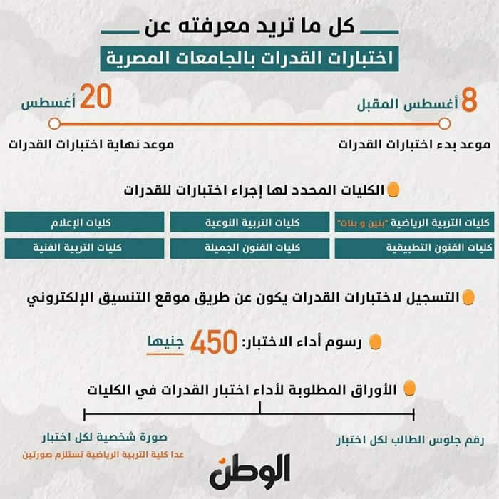 ● سيتم تسجيل المواعيد واختيار الكليات وأماكن أداء اختبارات القدرات المؤهلة لها، وذلك عن طريق خدمة التنسيق الإلكتروني على شبكة الإنترنت، على الموقع التالي: www.tansik.egypt.gov.eg