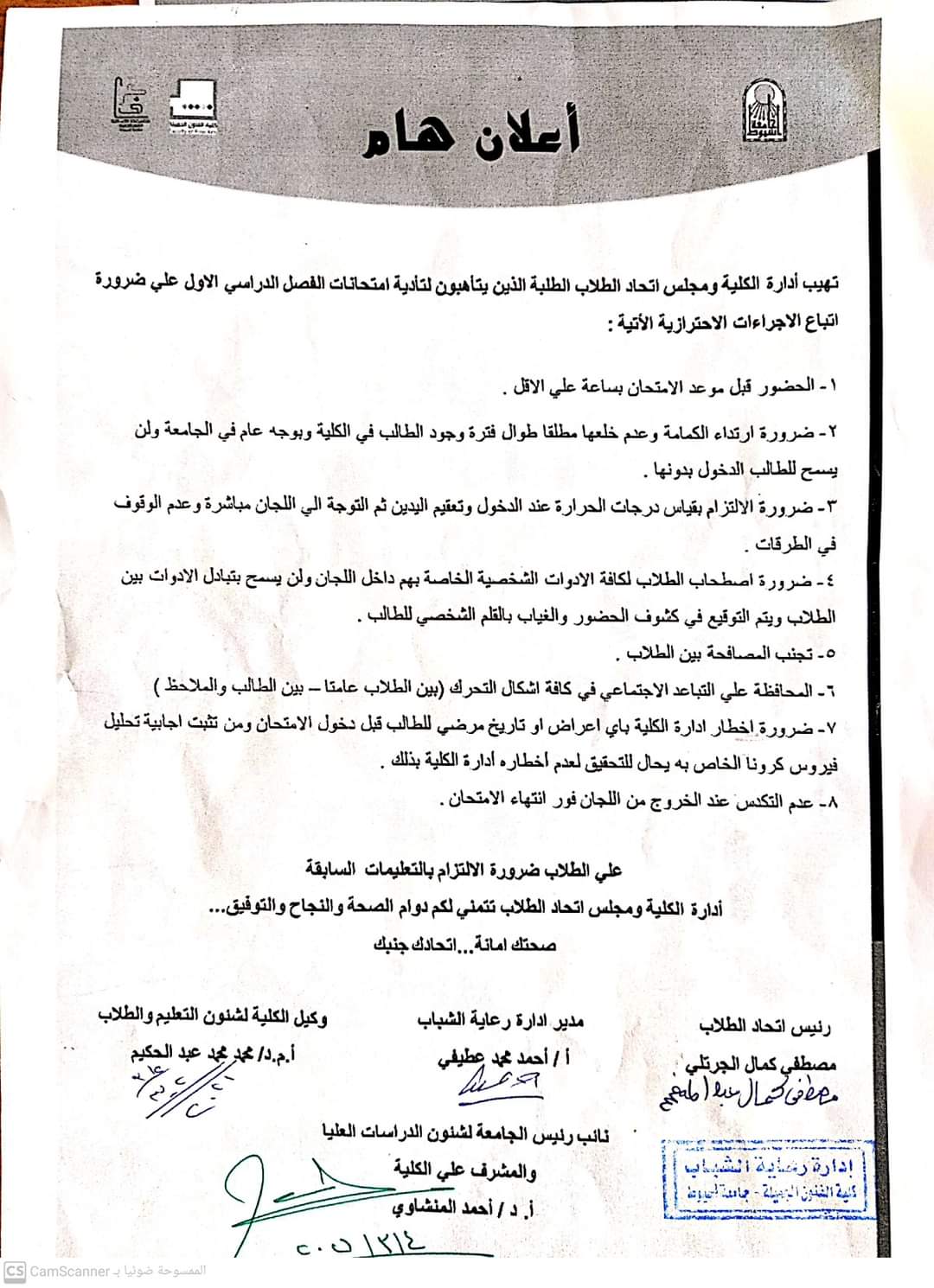 حيث وجّه الأستاذ الدكتور أحمد المنشاوى نائب رئيس الجامعة لشئون الدراسات العليا والبحوث والمشرف على الكلية بضرورة الالتزام بكافة الإجراءات الاحترازية التي وضعتها الجامعة لضبط العملية الامتحانية أثناء تأدية امتحانات الفصل الدراسي الأول 2021 مشددًا على ضرورة الالتزام بالإجراءات الاحترازية لمواجهة عدوى فيروس "كورونا"
