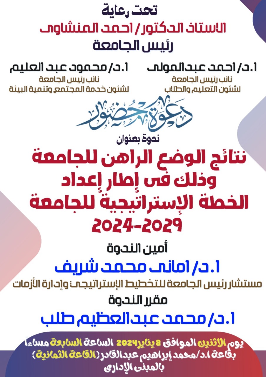 في اطار سعي الجامعة لوضع اليات للاستفادة من اعمال الطلاب وافادة الطلاب، وتحت رعاية السيد الاستاذ الدكتور/ أحمد المنشاوي رئيس الجامعة، والسيد الاستاذ الدكتور/ أحمد عبد المولى نائب رئيس الجامعة لشئون التعليم والطلاب، استقبلت الكلية الخميس ١٨-١-٢٠٢٤ لجنة وضع آلية للاستفادة من الاعمال الطلابية بالجامعة، والتي تضم في عضويتها كل من ا.د. رجب الكحلاوى وكيل كلية الحقوق لشئون التعليم والطلاب، ا.د. ياسمين الكحكى وكيل كلية التربية النوعية لشئون التعليم والطلاب، ا.د. نجوان عباس وكيل تربية طفولة لشئون التعليم والطلاب، ا. محمود ابو المعالي رئيس الادارة المركزية للشئون القانونية، ا. حاتم خضير مدير شئون الطلاب المركزية، ا. هابى مصطفى سيد ..مدير عام ادارة الحوكمة، بجانب ا.م.د. محمد محمد عبدالحكيم وكيل الكلية لشئون التعليم والطلاب وعضو اللجنة. وقد رافق سيادتهم في الزيارة داخل الكلية كل من ا.م.د. محمد محمد عبدالحكيم وكيل الكلية، والاستاذ / مخلص فاروق امين الكلية ومدير ادارة شئون الطلاب بالكلية.