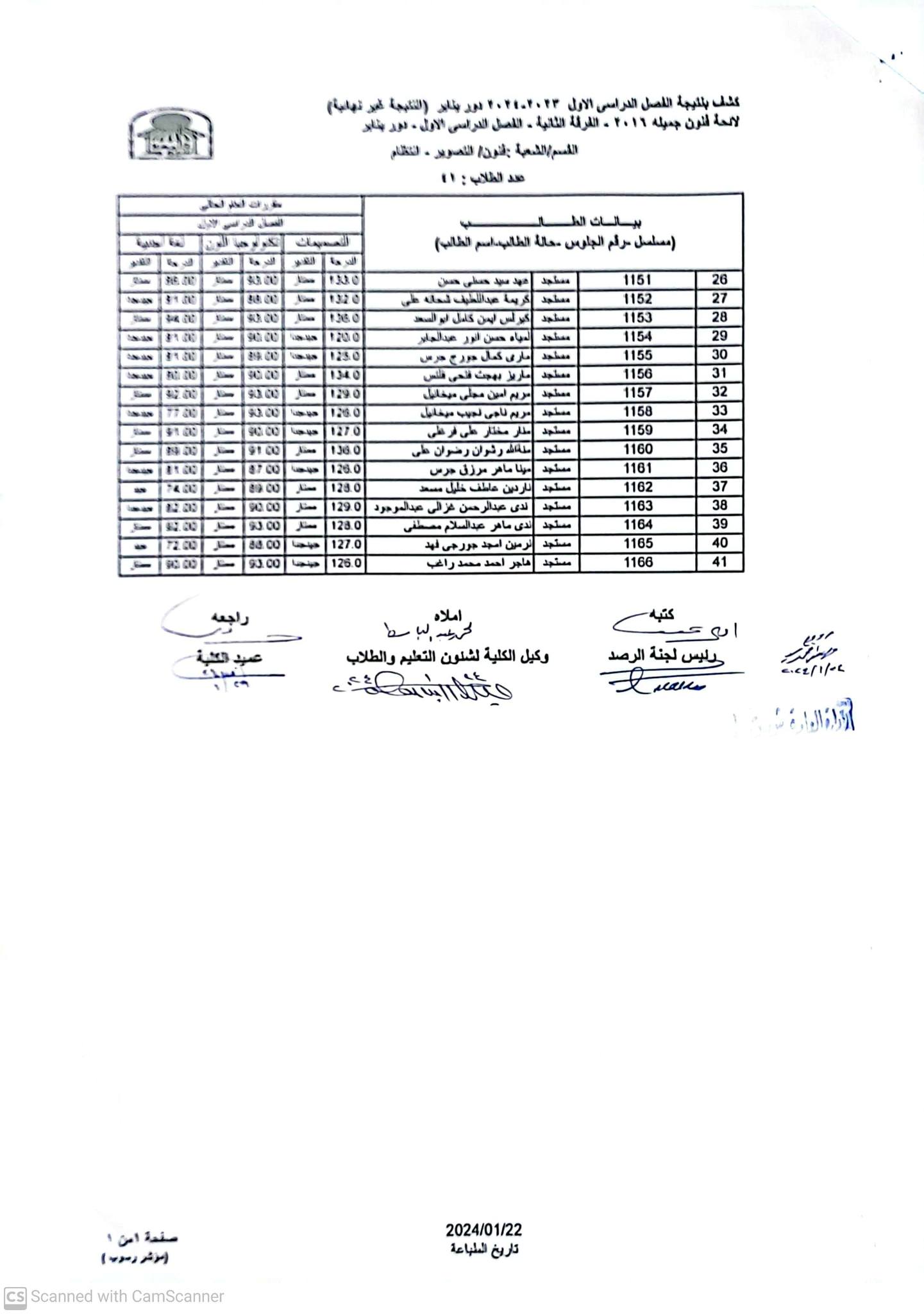 نتيجة الفرقة الثانية - قسم التصوير - الفصل الدراسى الاول - العام الجامعى 2023-2024م