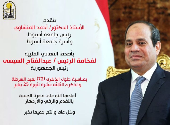 بعث الدكتور أحمد المنشاوي، رئيس جامعة أسيوط؛ برقية تهنئة للرئيس عبد الفتاح السيسي، رئيس الجمهورية، بالأصالة عن نفسه، وبالإنابة عن أسرة جامعةأسيوط؛ بمناسبة حلول الذكرى 72 بمناسبة عيد الشرطة والذكرى 13 لثورة 25 يناير.