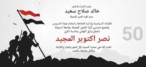 يتقدم السيد الاستاذ الدكتور/ خالد صلاح..عميد الكلية للقيادة السياسية وإدارة الجامعة وإدارة الكلية وجميع منتسبي كلية الفنون الجميلة بجامعة أسيوط من اعضاء هيئة التدريس والهيئة المعاونة والعاملين والطلاب بأجمل وأصدق وأرق التهاني بمناسبة الذكري الخمسين لنصر اكتوبر المجيد.. اعاده الله علينا وعليكم وعلي مصرنا الحبيبة بكل الخير والعزة والكرامة والمنعة والنصر أعواما عديدة وأزمنة مديدة.