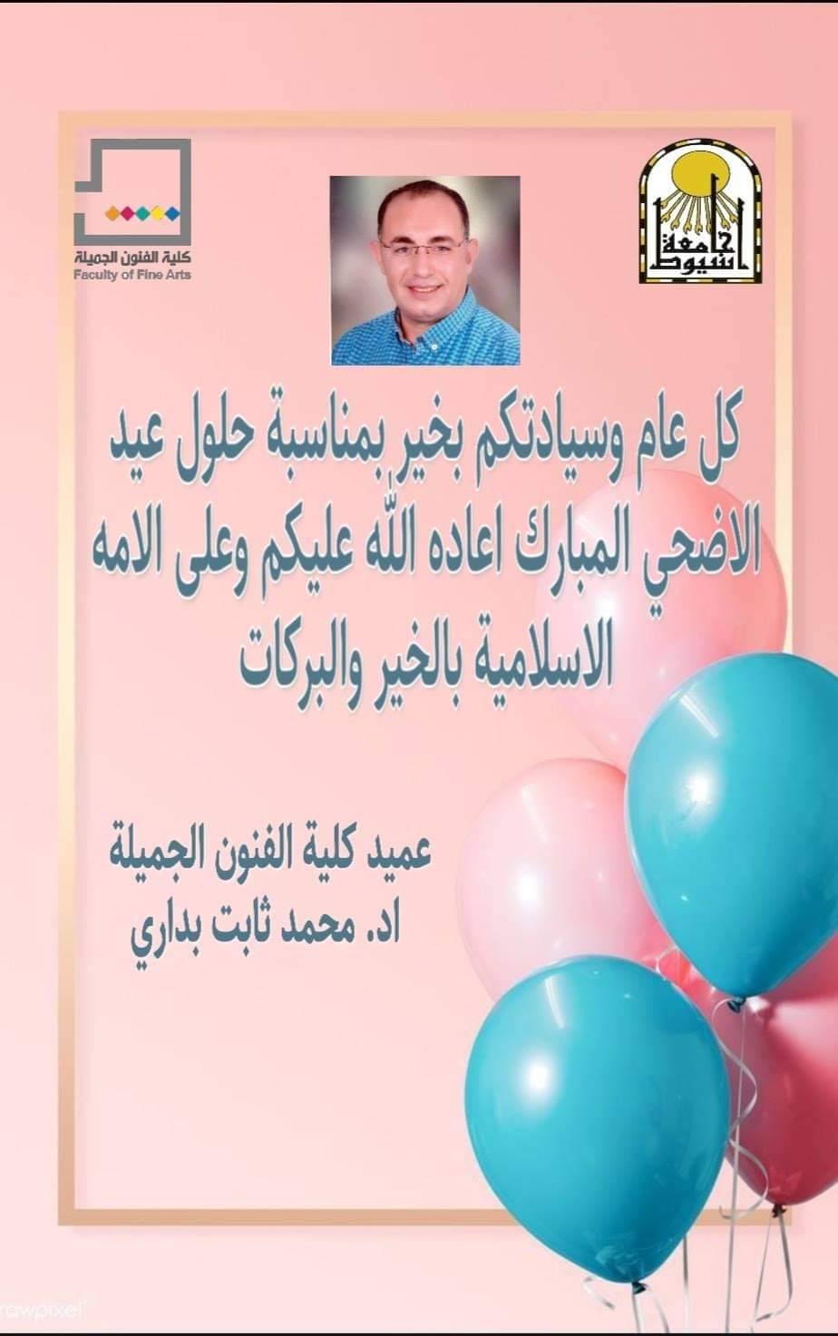 تتقدم أسرة كلية الفنون الجميلة بأجمل وأرق التهاني للسادة وكلاء الكلية والسادة أعضاء هيئة التدريس و معاونيهم و السيد أمين الكلية وجميع العاملين والطلاب بالكلية بمناسبة حلول عيد الأضحى المبارك أعاده الله علينا و على الأمة الإسلامية و مصرنا الحبيبة بالخير و البركات
