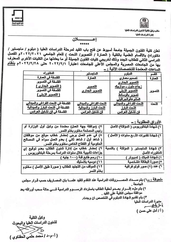 تعلن كلية الفنون الجميلة جامعة أسيوط علي فتح باب القيد لمرحلة الدراسات العليا (دبلوم- ماجستير - دكتوراة) بالاقسام العلمية بالكلية (عمارة - تصوير - نحت) للعام الجامعي 2021/2022