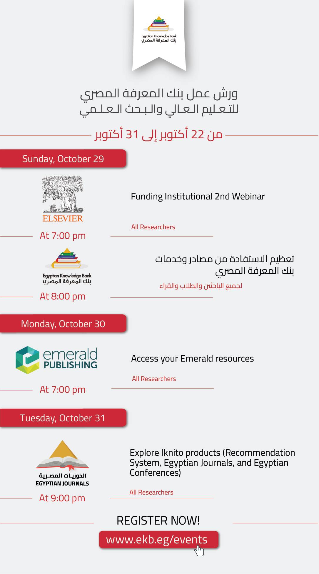 للطلاب الجامعيين والباحثين وأعضاء هيئة التدريس، تعرف على الجدول الاسبوعي لورش عمل بنك المعرفة المصري المجانية الأونلاين للفترة من 22 أكتوبر إلى 31 أكتوبر.