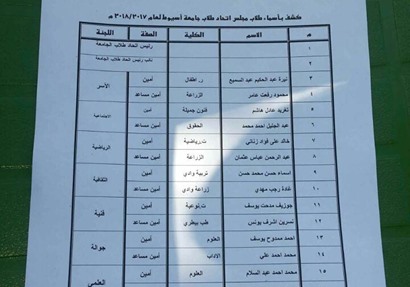Dr. Ahmed Abdu Jaeis, President of Assiut University, announced the end of the elections of the student unions today with the election of the Secretary General of the Union of University Students and his assistant and the secretaries of the Higher Committees of the Students' Union and their assistants which resulted in the victory of the student Rafiq Mohammed Rafiq Mohammed in the Faculty of Commerce. University Student Union. Which resulted in the victory of the student Nira Abdul Hakim Abdul Samiea College of kindergartens Secretary of the Committee of Families and Student Mahmoud Refaat Amer Faculty of Agriculture Amin Assistant, and the student Taghrid Adel Hashem Faculty of Fine Arts Secretary of the Social Park and student Abdul Jalil Ahmed Mohammed Faculty of Law Assistant Secretary, and won the student Khalid Ali Fouad Zanati In the Faculty of Physical Education in the Secretary of the Sports Committee and the student Abdul Rahman Abbas Osman Faculty of Agriculture Amin Assistant, and the victory of the student Asma Hassan Mohammed Hassan Faculty of Education Valley Branch Secretary of the Cultural Committee and student Ghada Ragab Mahdi Amin as assistant to the Committee, as well as the victory of Joseph Medhat Youssef Bakali Ahmed Mamdouh Yousef, Faculty of Sciences, Secretary of the Mobility Committee, Mohammed Ahmad Ali, Faculty of Arts, Assistant Professor, Ahmed Mohammed Abdul Salam, Faculty of Science, Secretary of the Scientific Committee, and Student Abdul Salam Ahmed. Abdul Sam in the Faculty of Sciences branch of the valley as an assistant.