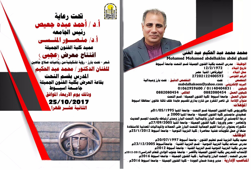 افتتح أ.د/ منصور المنسي عميد كلية الفنون الجميلة معرضاً فنياً للفنان الدكتور / محمد عبد الحكيم مدرس النحت بالكلية بعنوان (عجبي) شعر - نحت بارز - رؤية تشكيلية من رباعيات صلاح جاهين يوم الاربعاء الموافق 25/10/2017 بقاعة العرض بكلية الفنون الجميلة وذلك تحت رعاية أ.د/ احمد عبده جعيص رئيس الجامعة