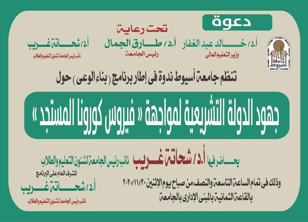 رئيس جامعة أسيوط يعلن إصداره قراراً بتخفيض العمالة ضمن الإجراءات الاحترازية لمنع انتشار فيروس كورونا مع إلغاء العمل بالفترة المسائية من أول ديسمبر القادم