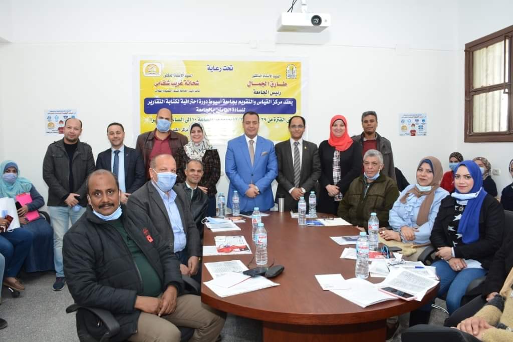 جامعة أسيوط تفتتح باكورة أنشطة مركز القياس والتقويم في مقره الجديد بدورة تدريبية بعنوان "احترافية كتابة التقارير"  أشاد الدكتور طارق الجمال رئيس جامعة أسيوط بالدور المحوري الذي يقوم به مركز القياس والتقويم بالجامعة في تطوير منظومة القياس والتقويم بكليات الجامعة ودعم نظم الامتحانات والتقويم، وأكد على عزم الجامعة على تطبيق الاختبارات الإلكترونية وتعميم التصحيح الإلكتروني في جميع الكليات وفقاً للمعايير الدولية بما يسهم في تطوير كفاءة ومهارة طلاب وخريجي الجامعة وبالتالي يسهم في تعظيم استفادة المجتمع من قدرات وإمكانات أبنائه.   جاء ذلك تعقيباً على افتتاح الدكتور شحاتة غريب نائب رئيس الجامعة لشئون التعليم والطلاب لدورة تدريبية بعنوان "احترافية كتابة التقارير" والتي تعد باكورة أنشطة مركز القياس والتقويم في مقره الجديد بالجامعة، حيث أشاد سيادته برؤية المركز المهتمة بالريادة في مجالات القياس والتقويم محلياً وإقليمياً، وبأهداف المركز ومن أهمها تدريب أعضاء هيئة التدريس وموظفي الجامعة على استخدام أحدث التقنيات وتطوير مختلف مهاراتهم والارتقاء بمستوى أدائهم الوظيفي.   وفي هذا الصدد صرح الدكتور محمد مصطفى حمد مدير مركز القياس والتقويم أن الدورة التدريبية تستهدف تدريب 75 من موظفي الجامعة العاملين بمختلف وحدات ومراكز وإدارات الجامعة المعنيين بكتابة التقارير، وتتضمن تعريفهم بالتقرير وهو عرض كتابي للبيانات والمعلومات والحقائق الخاصة بتوثيق موضوع معين وبأهمية كتابة التقارير وأنواعه ومراحل كتابته وأجزائه.