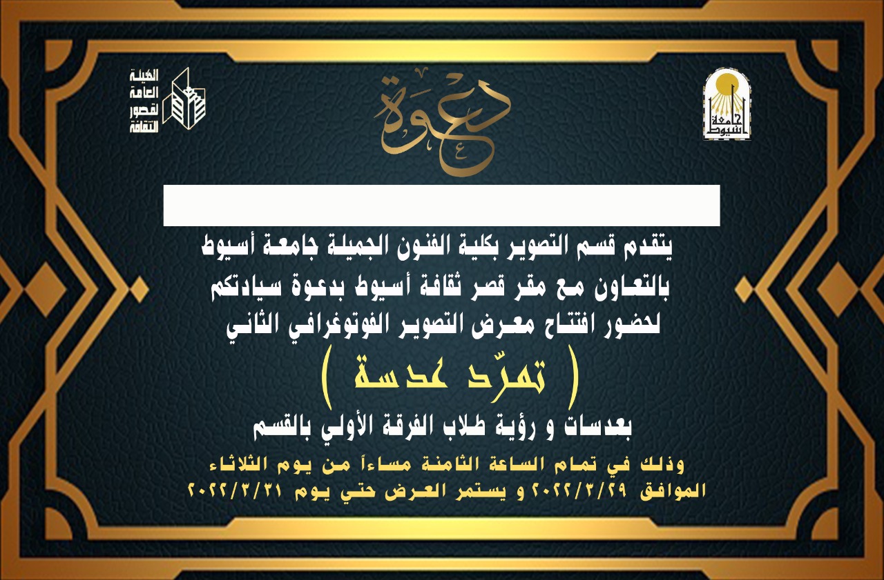 2022-03-29 الساعه الثامنه مساءا Thu, 31 Mar 2022 - 12:00 قصر الثقافة باسيوط معرض التصوير الفوتوغرافى الثانى (تمرّد عدسة)
