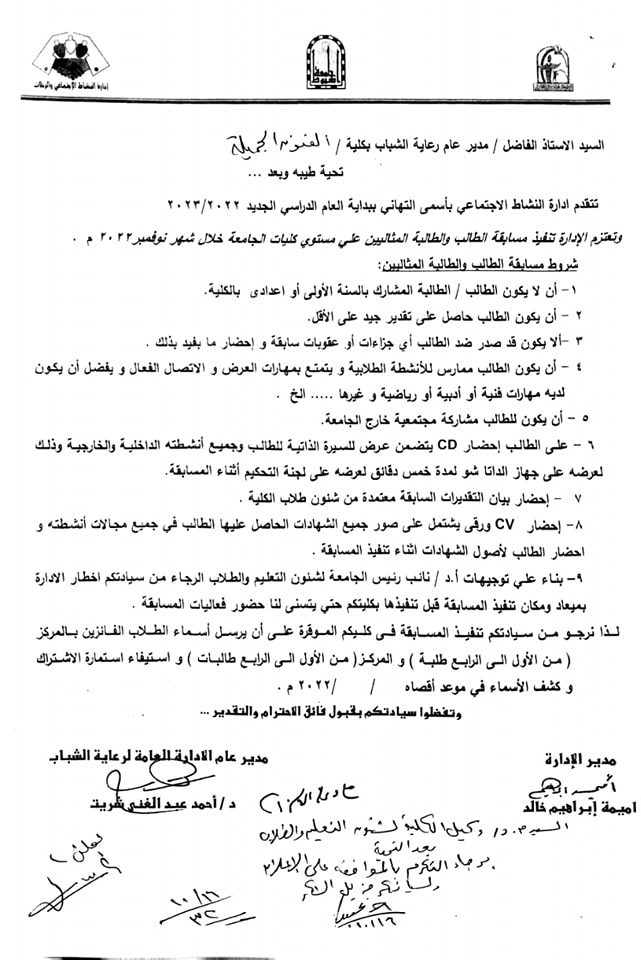 Note to all Assiut University students, everyone who registered their name in session No. 14 held from 25/9/2022 to 10/8/2022 in Military Education, Assiut University, hurry to go to their college affairs to receive a statement of success