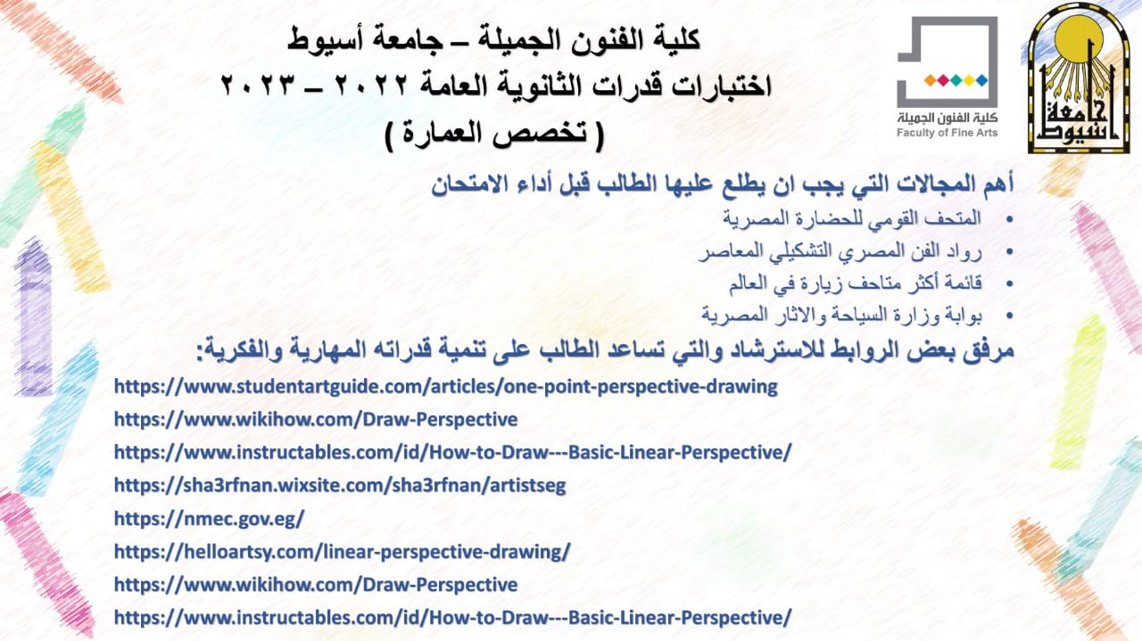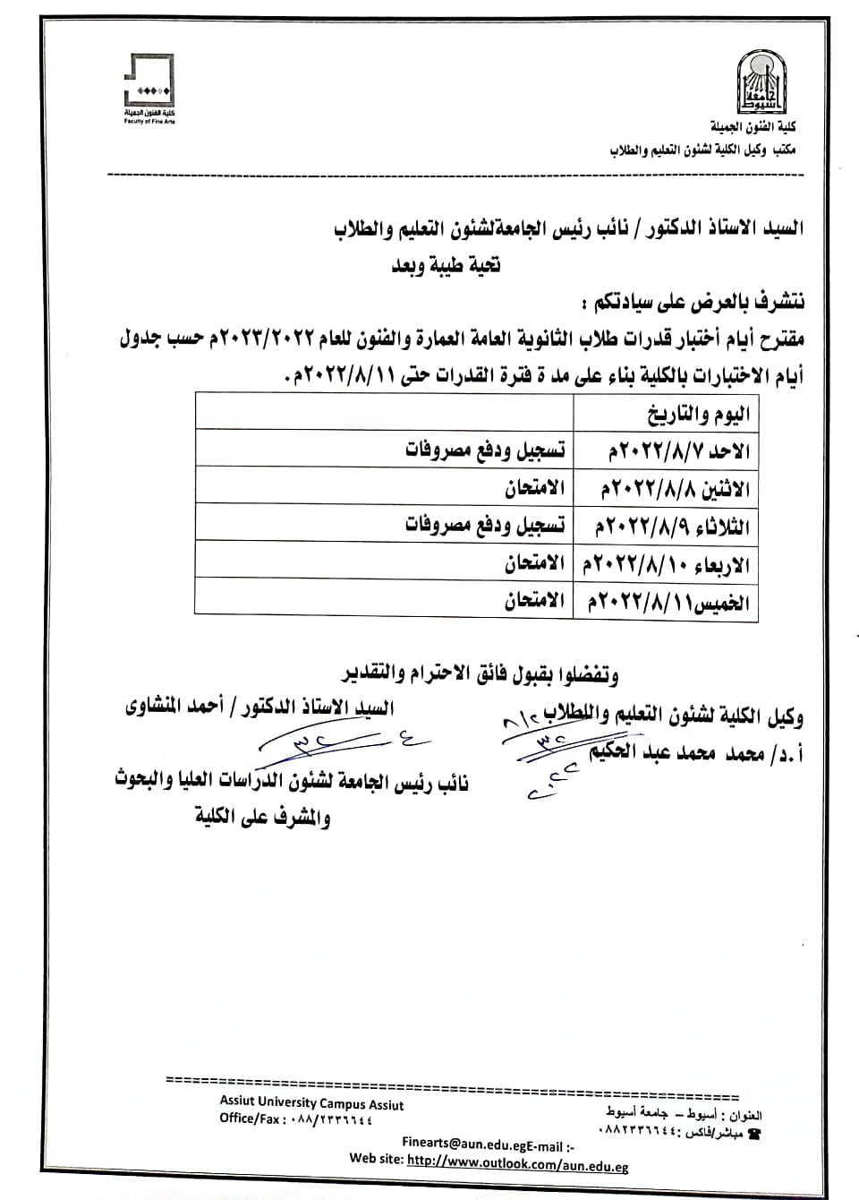 The application of students' grievances will be opened starting from 7/8/2022 and ending on 21/8/2022 and will not accept any grievances after this date, provided that the grievances are considered starting from 22/8/2022 and for a period of three days as follows:* Waiting in the grievances of the building on 22/8/2022* Decoration grievances are considered on 23/8/2022* Considers the grievances of the arts (photography - graphic - sculpture) on 24/8/2022.Anyone who fails to attend the consideration of grievances on time from the students submitting the grievances is considered to have waived a grievance and the student will be officially informed of this when applying for the grievance.