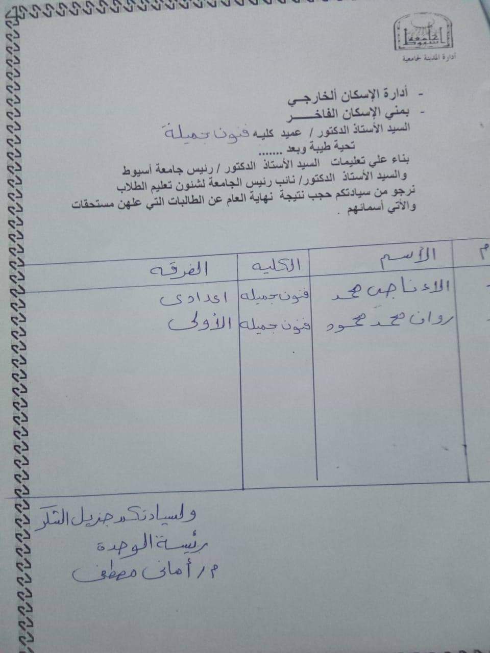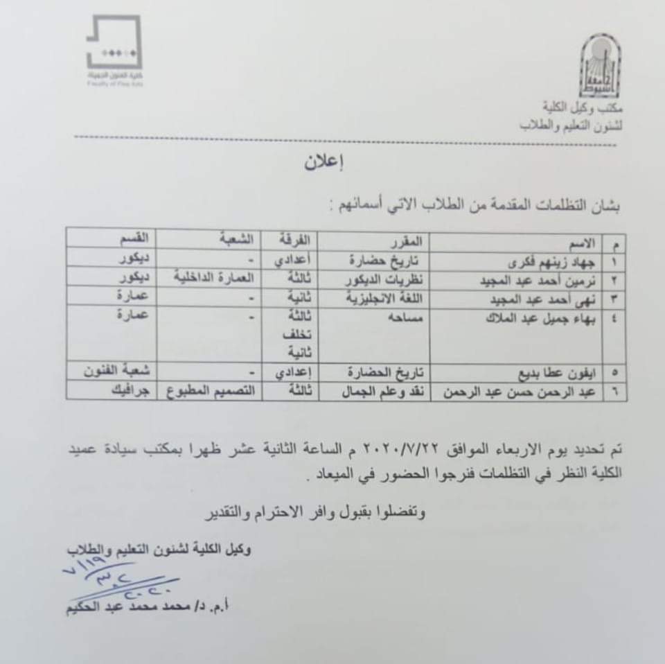 تنعي أسرة كلية الفنون الجميلة جامعة أسيوط بخالص الحزن والأسى وفاة المغفور لها بأذن الله